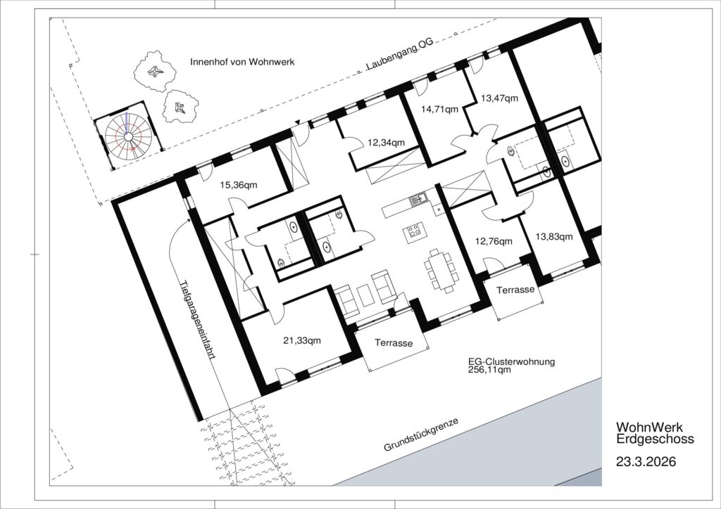 Unsere Pläne haben sich jetzt weiter konkretisiert. Da wir uns entschieden haben, nun doch eine Tiefgarage zu bauen, kann die Terrasse für die Cluster-Wohnung nicht mehr gen Westen gehen. Deshalb haben unsere Architekt:innen den Cluster neu sortiert. Und das ist das Ergebnis: