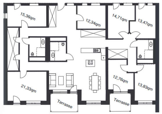 Wir wollen im WohnWerk einen solchen Cluster schaffen und so könnte es aussehen: Auf insgesamt 256 qm Wohnfläche befinden sich 7 Zimmer, 3 Bäder (eines davon rollstuhlgerecht), 1 großer Abstellraum und Platz für 3 Einbauschränke sowie die gemeinschaftliche Fläche mit Küche, Esszimmer und Wohnzimmer, dazu 2 Südterassen. Die Clusterwohnung befindet sich im Erdgeschoss des Südflügels.